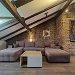 Charming Boutique Apartment In Skopje features a seating area and comes equipped with a sofa set and a work desk, and conveniences like an air conditioner. The property also includes media amenities such as a television, allowing guests to unwind at their leisure. Beds fitted with feather down pillows are at guests' disposal. A bathroom comes with a separate toilet and a shower, along with hairdryers and dressing gowns.